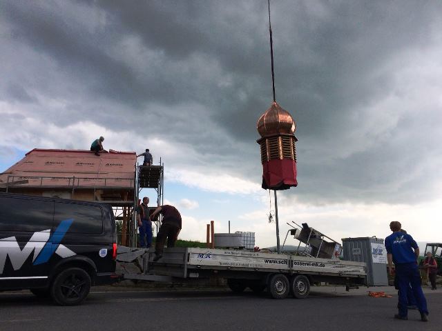 Der Glockenturm wird auf das Kapellendach gehoben und fixiert