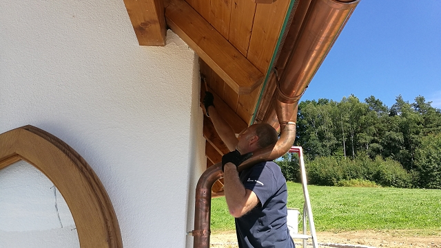 Mittlerweile wurden auch die Holzbretter und Sparren am Dachüberstand nochmals lasiert. Die Aussenfassade und der Innenraum werden nach der Austrocknung des Putzes erst vorraussichtlich Ende Juli gestrichen.