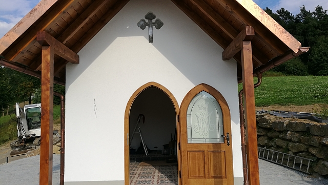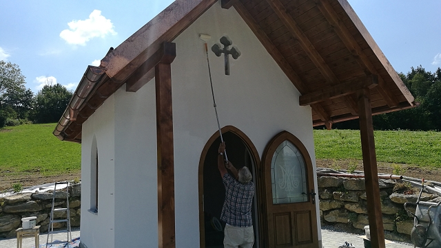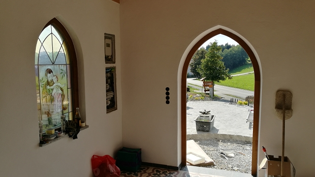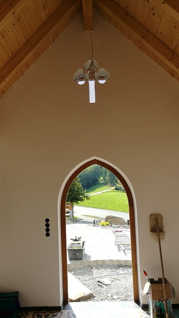 Die Steicharbeiten im Innen und Außenbereich der Kapelle sind abgeschlossen. Die Elektroinstallationen können nun beginnen.