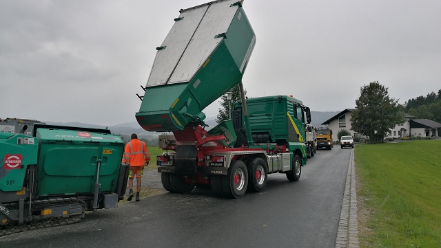 Eine Teerkolonne der Firma Streicher hat den Gehweg zur