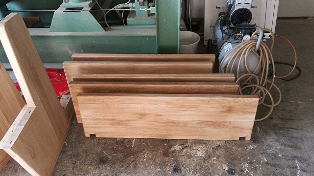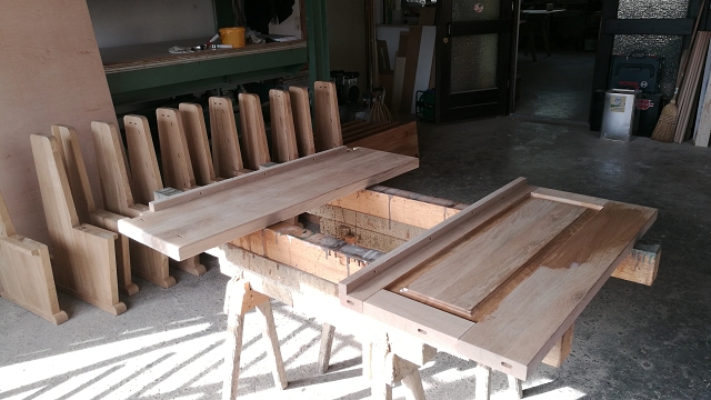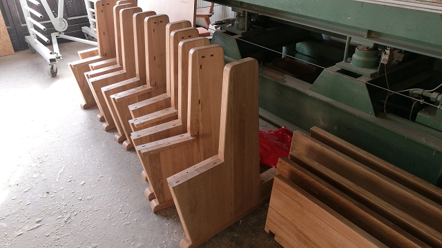Die Sitzbänke aus Eichenholz der neuen Kapelle werden zum ersten mal eingeölt. Nach dem Zusammenbau folgt der zweite Anstrich