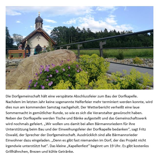 Rund 50 Bärmannsrieder haben bei einem schönen, lauen Sommerabend bis spät in die Nacht die endgültige Fertigstellung der Dorfkapelle gefeiert.