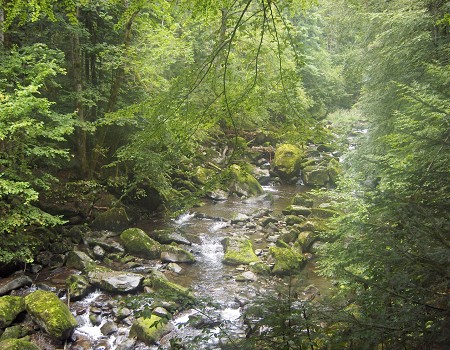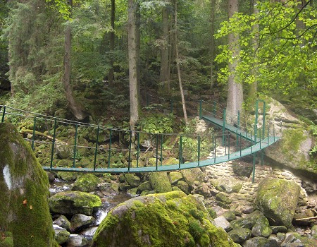 Diese rund 8 Kilometer lange Wanderroute führt immer entlang der Wolfsteiner Ohe, durch die sog. Buchberger Leite. Für den Rückweg nimmt man den gleichen Weg. Also sind es insgesamt 16 Kilometer die in 4 - 5 Stunden zu schaffen sind. Nach dem ersten Kilometer erreicht man eine Hängebrücke, die man überqueren muss. Weiter geht es auf dem anderen Ufer Flußaufwärts. |