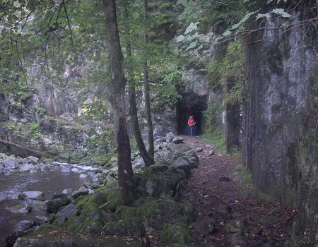 Bei einer Wandertafel ist der Eingang zu einem in den Fels geschlagenen, rund 50 Meter langem Tunnel. Am anderen Ende beginnt der schönste Teil der Strecke. Nach Freyung sind es jetzt noch 5,5 Kilometer.