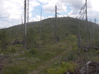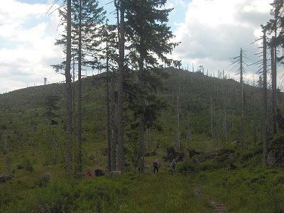 Am Reischfleck Sattel trifft man auf den Europawanderweg E6, grünes Dreieck, und den Goldsteig-Wanderweg, entlang der Kaitersberg-Arber Hochtour. Von hier aus geht es links weiter in Richtung Heugstatt-Arber. | |