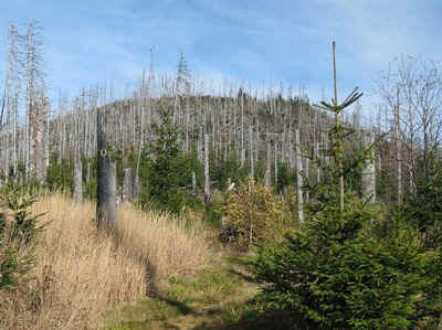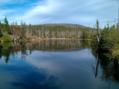 Nun gehts weiter in Richtung Siebensteinkopf und Moldauquelle. Über den Siebensteinkopf gehen wir aber erst auf dem Rückweg. Wir gehen erst am Siebensteinkopf vorbei und folgen erstmal der Markierung zur Moldauquelle. Hier unterhalb des Siebensteinkopfes befindet sich die Grenze zu Tschechien. Bis zur Moldauquelle sind es rund 30 Minuten. Nach dem Abstecher zur Moldauquelle geht es den gleichen Weg wieder zurück bis zum Siebensteinkopf. Nach einem kurzem Aufstieg zum Gipfelkreuz ist eine Rastpause zu empfehlen. Von hier aus ist ein herrlicher Ausblick über die höhen des Bayerischen Waldes zu genießen. In Fönwetterlage sind auch die Alpen am Horizont zu sehen. |