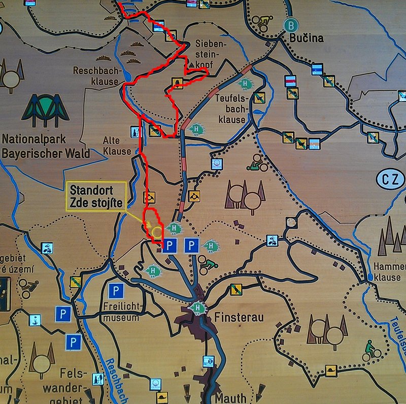 Der Ausgangspunkt dieser Wanderung ist der Wanderparkplatz Wistlberg am Ende der "Buchwaldstraße" in Finsterau. Hier befindet sich eine Holzhütte mit Infotafeln. Wir folgen auf dieser Route immer den Hinweisen Alte Klause, Reschbachklause, Moldauquelle, Siebensteinkopf, Schwellgraben und über die Alte Klause und Finsterauer Filz wieder zurück zum Parkplatz Wistlberg. Die Wege sind gut ausgeschildert.